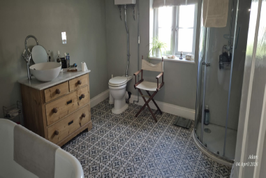 Beautifully appointed and finished in a contemporary style, the family bathroom comprises a four-