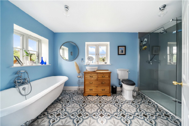 Beautifully appointed and finished in a contemporary style, the family bathroom comprises a four-